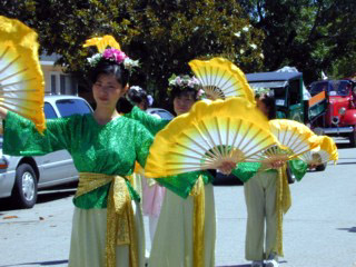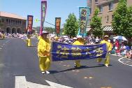 部份湾区法轮功学员参加了加州湾区阿拉米达(Alameda)市举行了传统的每年一次的独立日游行。7月4日上午9点钟,在游行开始前两小时,学员们就已在游行的出发点列队排练了。游行于十一点开始,一百五十个不同团体身着各式服装的队伍走在一起,附近的居民很多都全家一起在路边观看游行队伍。