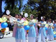当法轮功学员的队列经过主席台时,大会介绍说,去年法轮功的游行队伍就给我们留下了非常美好的印象,今天再次欢迎法轮大法的到来!法轮大法几乎在湾区的每一个城市都有炼功点,而且都是免费学功。