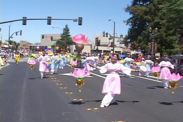 来自苗必达、圣荷西等城市的大法学员们来到了苗必达(Milpitas)市参加游行。当游行队伍经过主席台时,市长热情地向学员们挥手,并向观众介绍法轮大法。并看着我们的横幅上的字大声说出“修炼带来和平和健康。”