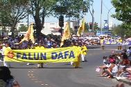 身穿“真、善、忍”字样法轮功服装的学员们个个面带微笑,友善地向两侧观众挥手致意。游行结束后,法轮功的队伍获得了步行并列一等奖。