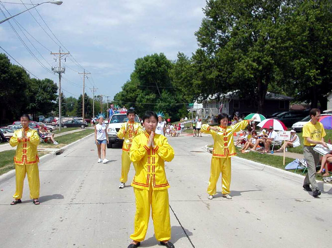 【明慧网2003年7月6日】七月四日,大法弟子参加了爱荷华州科罗维尔的国庆游行。观众反映热烈,积极索取大法材料,大法弟子的功法演示得到众人的鼓掌和欢呼。