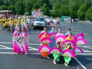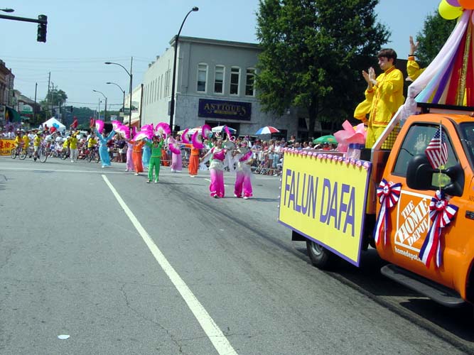 【明慧网2003年7月6日】美国各地7月4日庆祝独立日。乔治亚洲法轮功学员参加亚特兰大Marietta的庆祝独立日游行。中国古典的翩翩扇子舞,让美国人对中国传统文化赞叹不已。除了古典的仙女扇子舞,还有花车上的功法表演,小孩子自行车队,男女老少学员都有。法轮功学员一路走过,掌声不断,“Happy 4th of July”(独立日快乐), “Falun Dafa is Good”(法轮大法好) 此起彼伏。