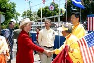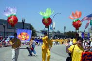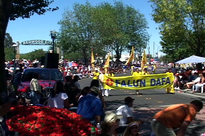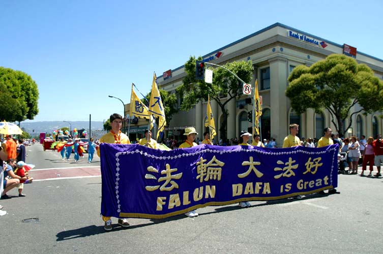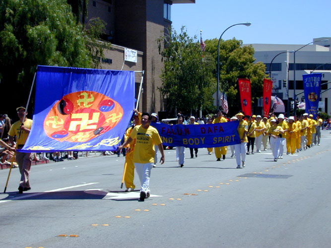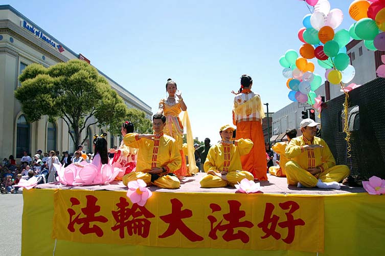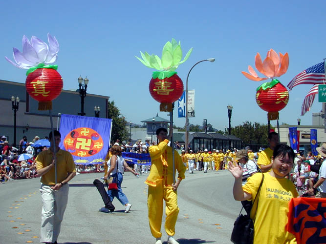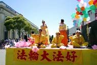 【明慧网2003年7月6日】七月四日,法轮功学员参加了旧金山湾区每年一度的独立日大游行活动。法轮功学员们色彩绚丽的花车、舒缓美妙的音乐、婀娜动人的舞蹈和优美的功法表演赢得了人们热烈的掌声和欢呼声。法轮大法祥和美好的印象留在了每一位在场观众的心中。