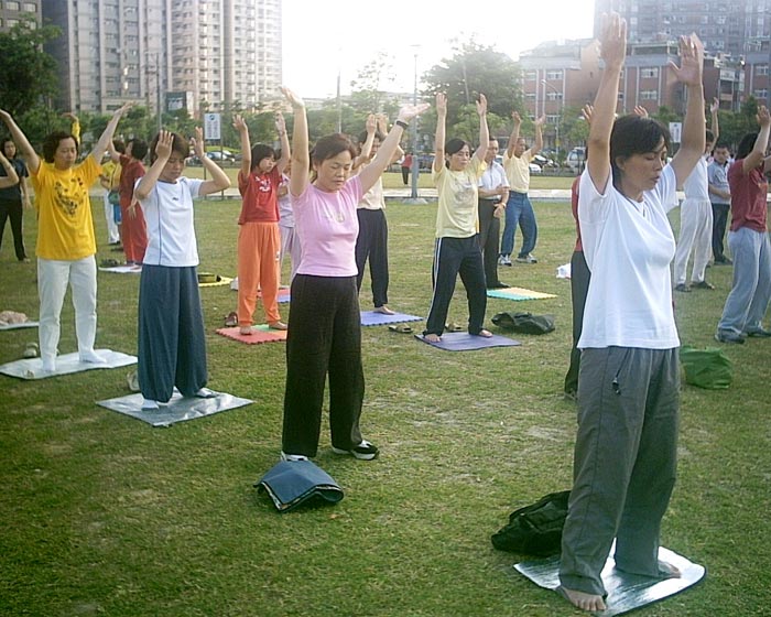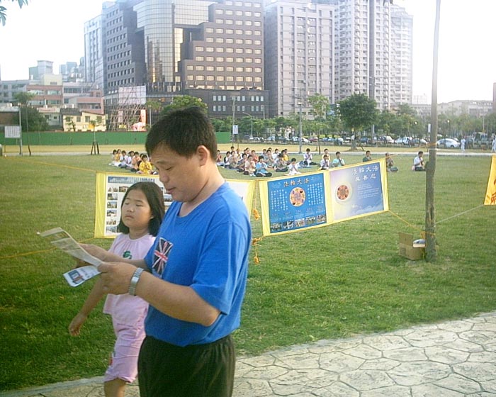 【明慧网2003年7月7日】台湾桃园地区在7月6日于中正公园举办集体晨炼,由于是假日,来公园运动的民众特别多。在功法演练的同时,部分学员开始做反对香港23条立法的征签活动,民众回馈很踊跃。有老伯看到穿「法轮功」衣服的学员走近,便竖起大拇指说:「法轮功好!法轮功好!」我们在现场同时还布置了大法洪传11年的图片展,使过往的民众,不论是对反23条的诉求或是大法洪传的情况,都有更进一步的理解。