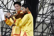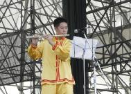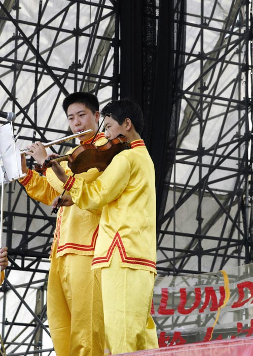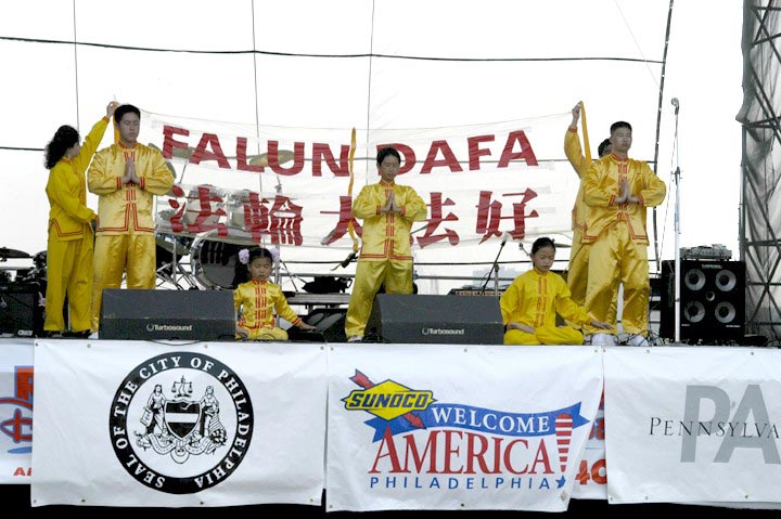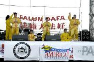 节日庆祝活动还有舞台表演。法轮功学员也应邀表演功法及艺术节目。学员在极短的时间内编排了节目,以歌颂“法轮大法”为主题,让费城的孩子们看到“真、善、忍”的美好。学员用心歌颂大法,解说的学员在节目中讲解了大法介绍,曲目的解释,师父传法的伟大,残酷的迫害,并当场采访表演的小弟子,小弟子发自内心的回答,可爱又感人,引来观众阵阵掌声。