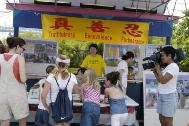 来到我们展台的家长和孩子,有的在昨天看到了我们的游行表演说,“简直太漂亮了!炼功点在哪里?”有的曾在电视上看到过有关法轮功的讨论,“镇压太残酷了,全是编造的谎言。”有个孩子告诉学员,“我能感到这个展台这儿有一股温暖的能量。太奇妙了!”“这些孩子的打坐太美了!什么能使他们这么自律呢?”每个人都啧啧称赞“真、善、忍”这三个字的美丽。