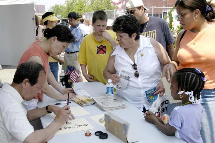 法轮功的展台在入口处,金黄的横幅,非常气派显眼。学员们还专为这次“孩子日”赶制了5张介绍大法小弟子修炼的展板,引来众多家长和孩子观看。展台前,大法弟子陈老先生设笔墨纸砚,为孩子们书“真、善、忍”留念,人们如视珍宝,排队渴求,展台前的队伍总是象长龙似的,从未得闲。学员们则一面解释中文书法这三个字,一面介绍大法,并引导孩子遵循“真、善、忍”原理做人,家长孩子都点头称是。