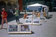 星期六,在维尔斯堡市(Wuerzburg)举办了又一个关于紧急救援受的法轮功学员和江××在美国被起诉的信息日。人们从横幅上的大写字上可以了解到江××因群体灭绝罪被起诉。有的行人还给横幅照了相。许多从我们这儿走过的市民过来在呼吁书上签名。有的直接过来没有问就自愿签名。