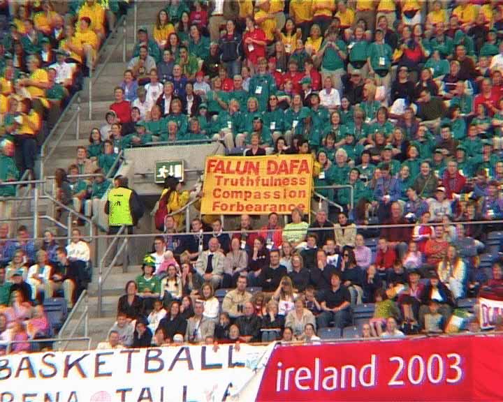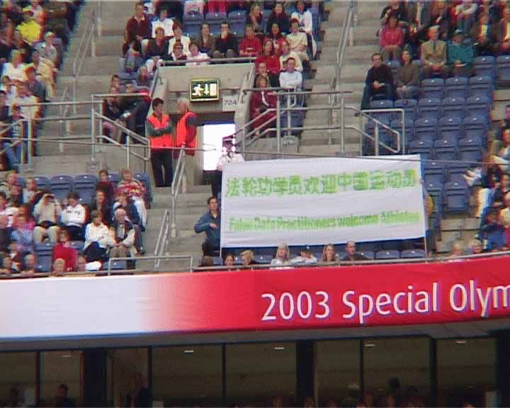 【明慧网2003年7月9日】6月29日,2003世界夏季特别奥运会(“特奥会”或“残奥会”)闭幕式在爱尔兰都柏林克罗体育场(Croke Park)举行。当地警察特意为法轮功学员找来几张入场券,几位学员入场参加庆祝。“法轮大法,真、善、忍”的英文横幅和“法轮功学员欢迎中国运动员”的中英文横幅在表演台的正面看台上高高竖起,展示给数万的观众及代表团。