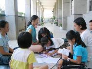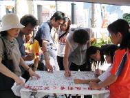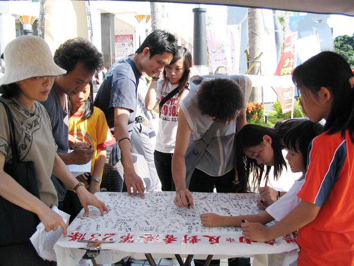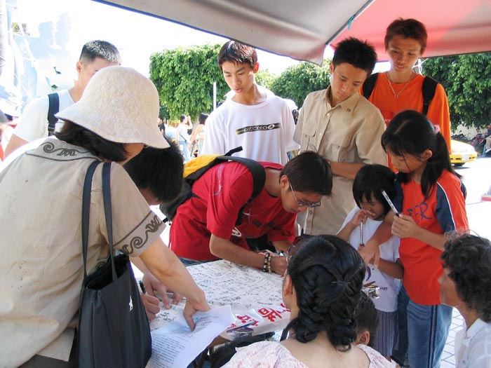 6月29日明慧小弟子在台南远东百货前广场,挥汗为反对香港23条立法征签,告知民众此一消息的重要性。(见图三、四)