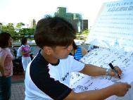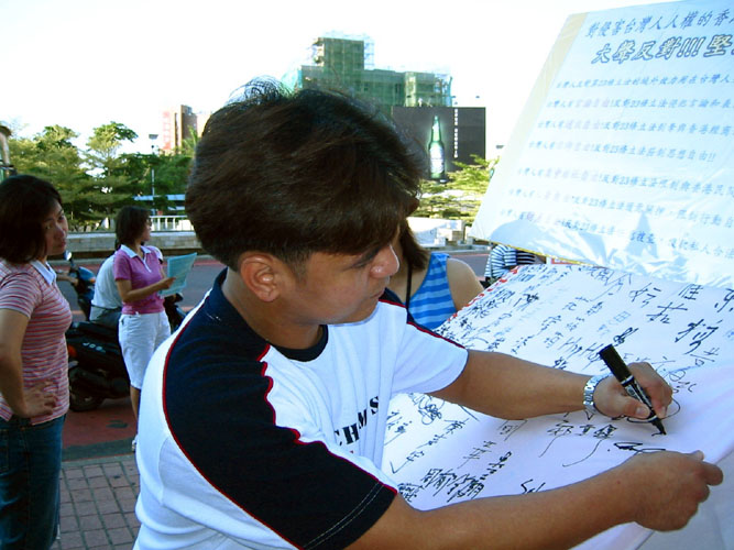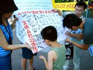 就在活动接近尾声时,有位学员见到一位小姐状似疲倦地坐在石阶上,便趋前询问是否有需要协助的地方,才知道小姐因为脚痛的关系,只能稍稍坐在石阶上休息,再行赶路。当学员递上反对香港23条立法资料时,小姐回答她听过但不了解具体情形,经学员稍作解释后,她说她明白了也知道了-- 一旦23条立法强制通过,台湾人的基本人权在香港将遭受威胁,每年到香港旅游与观光的民众也将因此而减少。但因为脚痛的关系,不方便行动,在学员征得对方的同意后,学员便将征签布条送到小姐歇脚处,让对方签下名字,征签活动也在傍晚七点多左右顺利落幕。