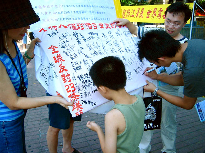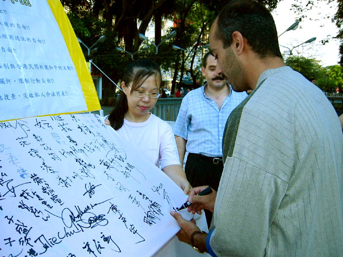 有一对老年夫妇经过,当学员向她们提到反对23条立法征签时,老妇人眼睛一亮说,我就是要找这个,我都知道,我就是要签名的。而且一边签学员一边说江政府对法轮功的镇压,老妇人说我早就知道,他们〈指中共政府〉太不像话了。说的时候,眼里满是愤慨。她先生也毅然的签下了名字。还有一个小姐听了解说,表示了相当大的愤慨,直说让香港人全部移民,要不就全世界人起来反对中共政府等等。