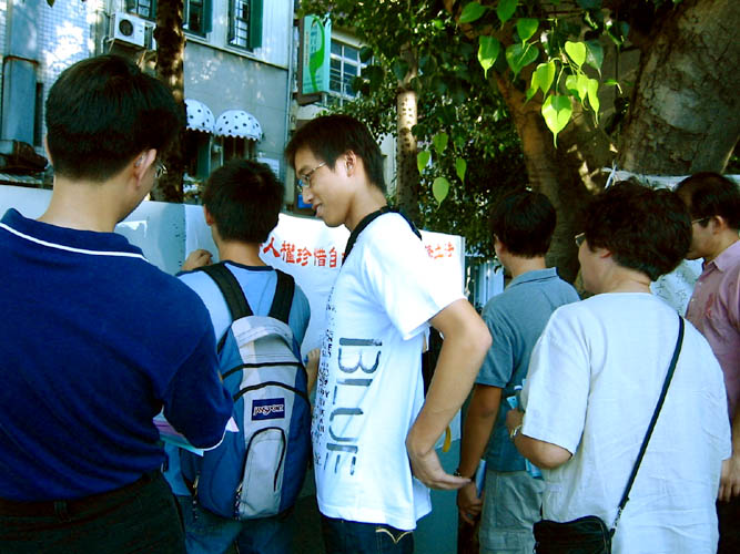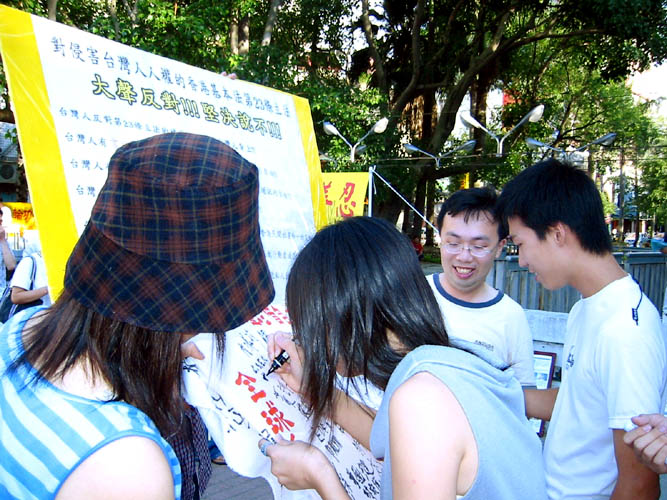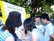 还有两位交大的同学一开始表示没有听过香港23条立法,经学员耐心的解说香港23条立法相关资讯,并解释香港23条立法对台湾人的影响,两位交大的同学立刻展现出正义的态度,表示愿意签名共同声援反对香港23条立法。两位同学并表示学校有法轮功社团,但对法轮功没有太大的兴趣,也不了解法轮功。学员则耐心地为他们解说─法轮功是修炼真、善、忍的性命双修的功法、与法轮功在世界60多个国家弘传的现况。并希望有时间,两位同学能到学校社团进一步了解法轮功。