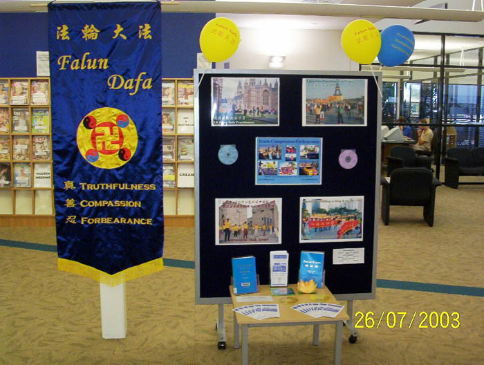 第二天,我们得到了在图书馆办展览的许可。一开始,这两家马凯的图书馆还担心我们是否是宗教或搞政治,但是在读过我们提供的材料,以及查看了其中一个网站后,他们高兴地接受了我们的申请。我们得到了一个极佳的位置,人们一进大门口就可以看到我们。我们展览的材料包括:一个漂亮的丝质横幅,纸叠的莲花、气球、图片、光碟和书籍等。我们可以在那里展览两周。马凯的另一家图书馆批准我们在九月举办展览。