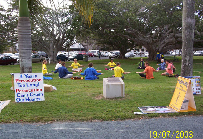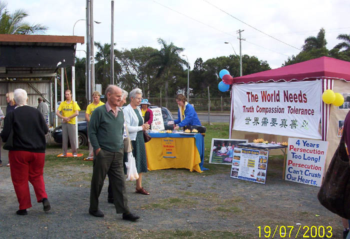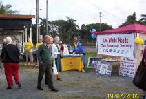 因为我们在市场摆放了这个摊位,那天下午其中一个炼功点来了三位新人。其中一人在离开前还购买了一本《转法轮》。我们展示照片的时候,许多正在对面参加一个大型音乐节的人们都被吸引过来看我们在干什么。