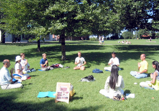 无论大法弟子是在公园里炼功,还是在路边展示功法,所到之处均受到周围人们的关注。他们主动向大法弟子索取资料。学员们更是不放过一切救度世人的机会,不断地向人们讲着真相。