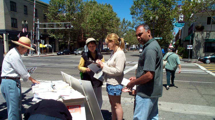 在广场入口处有一个法轮功洪法摊位,醒目地摆放着起诉江XX和营救李祥春的展板,桌上有各种相关资料。奥克兰的法轮功学员和湾区其它地区远道而来的学员们为营救李祥春展开了征签活动,并热情耐心地向游客介绍法轮功,讲清中国江氏集团迫害法轮功的真相。