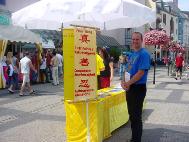搭起展位后我们先发正念。第一批感兴趣的人马上围住了我们的展桌,桌上摆着营救熊伟的签名表、书、传单、信息资料和书签等。小孩子很喜欢那些书签,一些孩子拿了很多的书签后才离开。一个土耳其小孩对中文资料很感兴趣,一个学员把资料给了他,小孩非常高兴,我们也很高兴。
