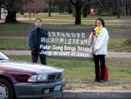 早晨8点,大法弟子们在中国大使馆前发完正念之后,就来到通向国会的主要马路上和平请愿。大法弟子打出“法轮大法”“真善忍”,以及“霍华德先生,请帮助制止在中国对法轮功的”“全世界法轮功学员将江泽民押上正义审判台”等横幅。此时正值上下班高峰,学员们静静的站在十字路口的四个角上,拉起的横幅从各个角度都能看到。很多善良的人为法轮功学员的不屈不挠、坚持正义的善良而和平的精神所感动,开车经过时向学员招手或鸣笛致意。