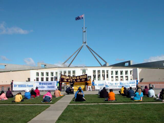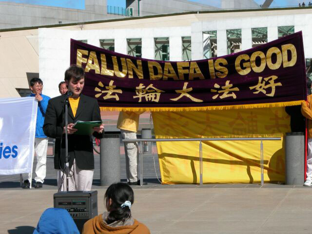 新闻发布会于上午11点在国会前举行,学员们先移聚在国会前炼功,而后发布会正式开始。法轮功学员代表欧文-赛德代表澳洲法轮功学员宣读了给霍华德总理的公开信。信中说:作为许多澳洲法轮功学员的代表,我们非常感谢您对法轮功在中国遭受迫害的关注,并诚恳的希望您在最近的访华时提及法轮功问题。
