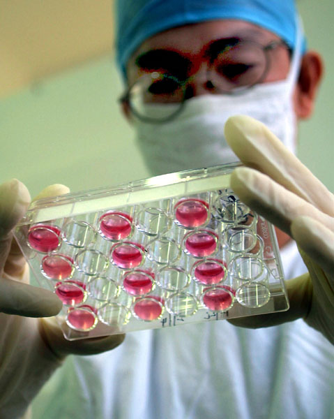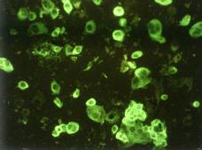 | 正在做萨斯病毒测试的中国广州科研人员。萨斯病2002年底最初从中国南方的广东省传出。(法新社图片) | 这张未注明日期的图片中,发亮的部分显示被萨斯病毒感染的人体细胞(暗色部分为正常人体细胞)。香港卫生部今年5月份说,该地区萨斯病人的死亡率已从11%上升到14%,并且他们发现萨斯病毒已变种,更具攻击性。(法新社图片) |