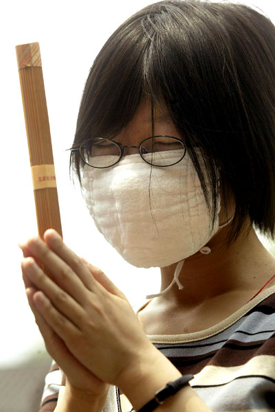 | 香港街头的有关萨斯病的提醒标语牌(法新社图片) | 一个戴口罩的女子在北京雍和宫外祈祷。因萨斯爆发,北京曾一度关闭雍和宫(法新社图片) |