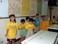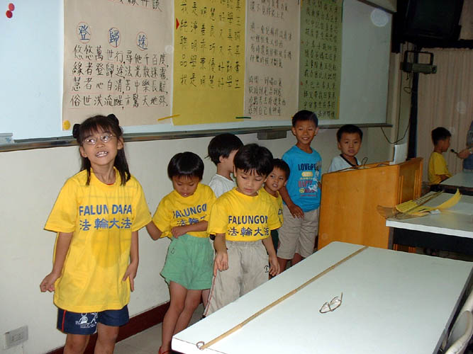 最特别的是儿童学法组,参加的小弟子人数超过一百人。这些小弟子多数都曾经参加过台北明慧学校,对于这种交流活动十分熟悉。除了学法、背诵经文之外,小组长安排了播放闪画、画画、唱歌与户外炼功等活动。令人惊讶的是,好多小朋友对于天安门自焚案的真象,都能侃侃而谈,都知道这是江××说谎,欺骗人民。