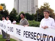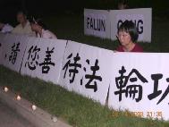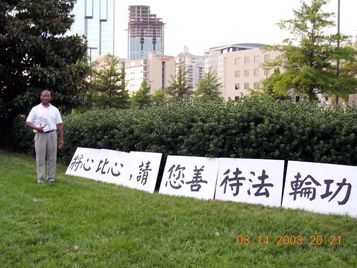14日傍晚,十余名法轮功学员参加了在Grand Hyatt酒店外的请愿活动,请愿横幅分别是中文“将心比心,请善待法轮功!”,英文“请帮助终止在中国的对法轮功的迫害!”亚特兰大居民吕朝晖先生介绍说,今年四月美国乔治亚州众议院全票通过了624决议,强烈谴责江泽民集团迫害法轮功,践踏人权的行径,并敦促美国国务院营救他被关押在中国劳教所已有两年多的妻子周雪菲。中国驻休斯顿胡总领事就624决议在给乔治亚州众议员代表的信中说,周雪菲在狱中非常健康。吕先生说这与事实完全不符。“我太太被关押在广东三水妇女劳教所已经是两年多了,我从来没有收到过一封她的信,我要求跟她通电话,那些警察也一直没有同意。从三水释放出来的其他的法轮功学员他们所受到的那种遭遇来看,很多人被电击过,有的人不让睡觉,我太太,他们是曾经不给她饭吃。几年来,一直都是被其他犯人给包夹,监视她,给她造成很大的精神压力。而且听她妈妈讲,她现在视力戴上眼镜以后只有0.1左右,所以我非常替她的健康担心。”