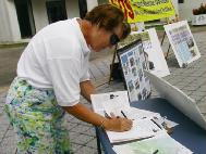 | 市民在签名簿上签字,支持营救Charles | 采访完毕后记者在签名簿上签字 | 向报纸、电视台记者展示部分被迫害致死学员的照片 |