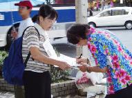 【明慧网2003年8月22日】8月17日金子容子救援会在福岛县的福岛市举行了呼吁尽快救出金子容子的签名活动。早上十点仙台、山形的学员和福岛市的学员一起在福岛车站附近的大百货商店前摆放了自己制作的展板,上面写有营救金子容子署名活动,金子容子的详细情况介绍以及江××在海外被起诉的情况等,并用录音机连续播放金子容子的情况及呼吁为救出容子希望人们协力签名。然后大家开始一边发资料,一边征集签名。