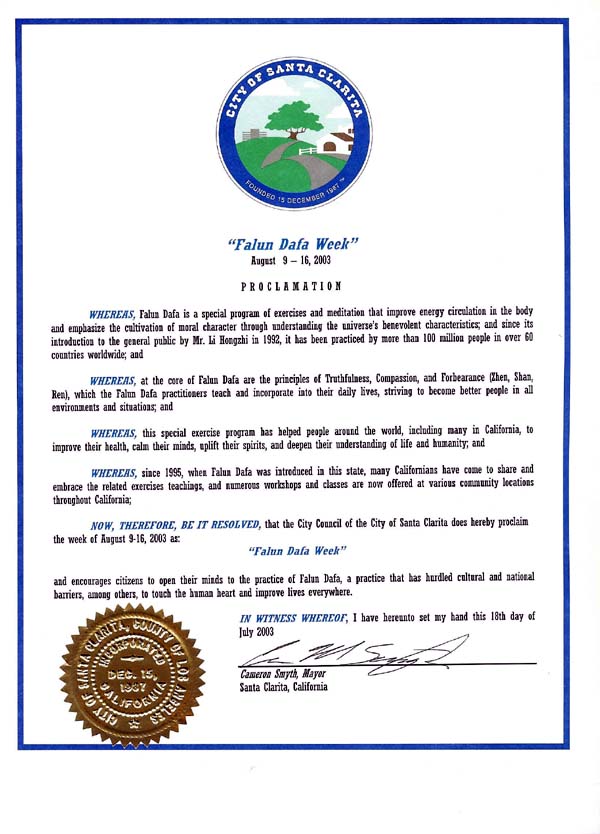鉴于,自从1995年法轮大法被介绍到本州以来,许多加利福尼亚人加入和接纳了相关的教功活动,现在在遍及加利福尼亚的许多社区内提供众多的研讨会和教功讲座班;