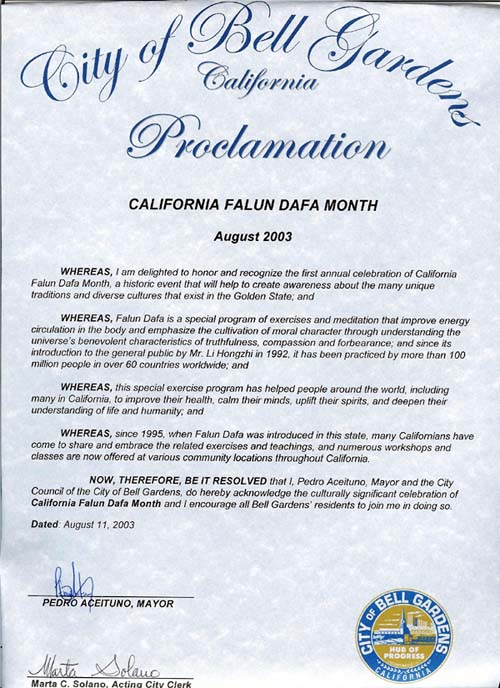 因此,现决定,我,皮德罗-艾西图诺市长和贝尔花园市议会特此祝贺具重要文化意义的加利福尼亚州法轮大法月,并鼓励所有贝尔花园市居民共同参与。