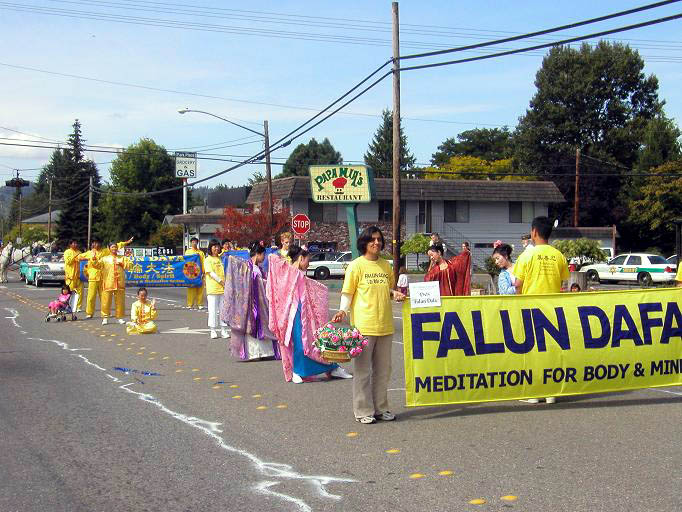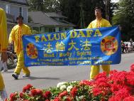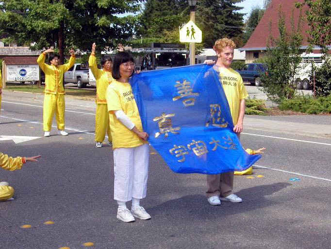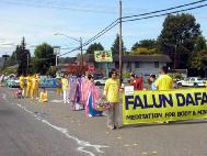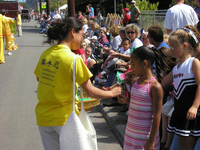 我们的游行队伍出现在人们面前时,主持人向观众作了法轮大法的简介,并向我们表示感谢。有些观众兴奋地把我们的游行队伍摄入了镜头。一群孩子相继拥向队伍最前面向拿着花篮的学员索取我们亲手制作的小莲花。善良的小城人民纷纷接过我们发的大法材料和营救李祥春的材料。