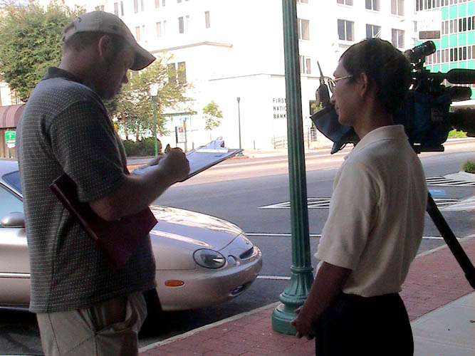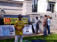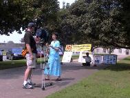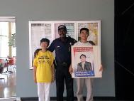 在接受采访中,学员讲述了四年来江氏集团对法轮功学员的残酷迫害,以及美国公民、法轮功学员查尔斯-李的情况。许多记者都问我们,美国政府和人们怎么才能帮助查尔斯,他们表示把相关的信息让老百姓都知道。有的记者当时就在我们的签名簿上郑重的签上了自己的名字并与学员合影表示支持。