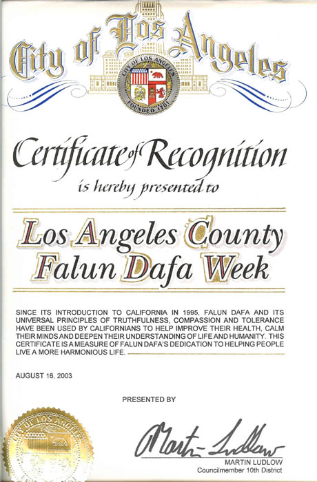自从法轮大法于1995年传入加利福尼亚州以来,法轮大法及其宇宙原理真、善、忍已经被加利福尼亚人用以改善健康、平静心灵、加深他们对生活与人性的理解。特颁发本证书以褒奖法轮大法为帮助人们过上更加和谐的生活所付出的努力。