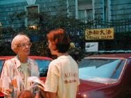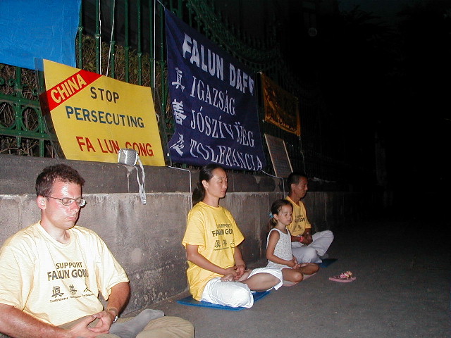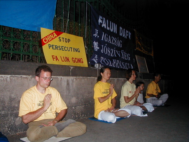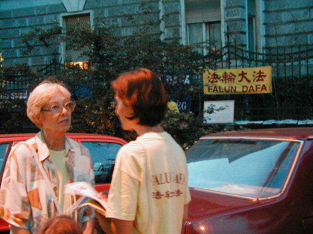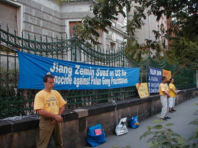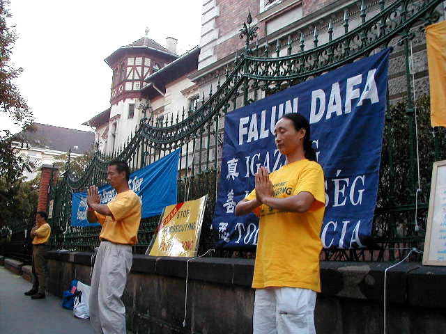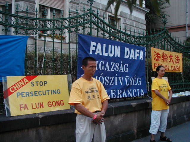 8月2日,匈牙利和奥地利的大法弟子来到布达佩斯的中国驻匈牙利大使馆前举行和平抗议,我们发正念并给行人分发关于中国政府对法轮功学员迫害的真相资料。我们轮流发正念、炼功,由此形成了一个非常祥和的场面。当时有许多行人,因此有许多交谈的机会,我们详细地给人们讲述了在中国发生的这场迫害情况。