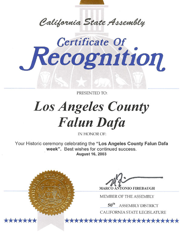 以嘉奖你们具有历史意义的“洛杉矶郡法轮大法周”庆典活动。衷心祝愿你们继续获得成功。