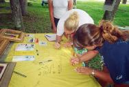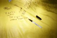 后来,我们把纸壳刻成阳文,例如“法”字刻成阳文后就成了左边三划加上一个“去”,成了四块。 到批发市场或街上可以做美术装璜、刻字或打字店询问有没有刻字用的不干胶纸(是单面胶,很多街上玻璃门上贴的就是这种字,颜色有红色的黄色的等),然后就用纸壳刻出的字模在不干胶上画出字型,就象做衣服根据衣服样裁衣服一样。把不干胶上的字剪下来,贴到条幅上,为防止条幅褶皱贴歪,把条幅用大夹子固定到门上,第一个条幅贴时注意字的间距和位置,其后的条幅都是覆盖到第一个条幅上,按前一个条幅贴的。这种方法多了些工序,几个人配合比较好。