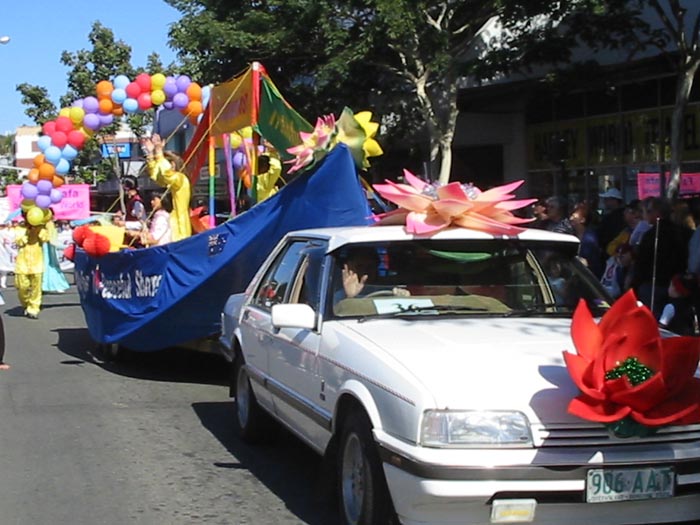 当游行队伍走过主席台时,司仪被眼前优美祥和,五彩缤纷的阵容深深感动,不停地向观众高声赞扬法轮功阵容的美好,观众们也连连为我们的队伍喝彩。当我们走到一座上面是铁路的天桥时,刚刚离站的一列客车上乘客也都看到了我们的游行队伍,向学员频频招手致意。游行的终点是一个公园,学员早已在那里布置好了资料台和图片展,并向观众连续演示功法。