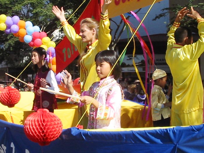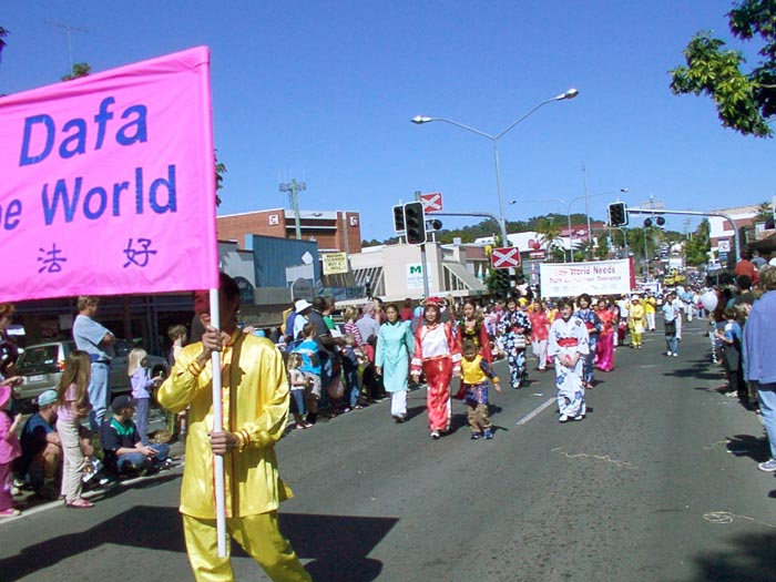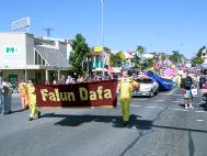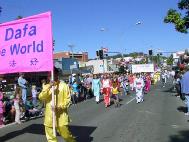 大法学员们给此次游行活动带来了祥和的能量,观众们都被法轮功学员的阵容所感动。部分学员身穿不同民族的传统服装,象征着法轮大法弘传世界,其余的学员随后而行,手中拿着写有“法轮大法好”,“法轮大法弘传世界”和“世界需要真、善、忍”字样的彩色横幅。还有的学员还边走边向沿途观众发送真相传单,人们都欣然接受。