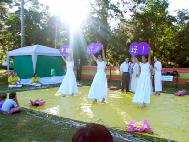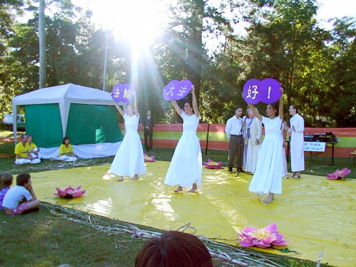 下午,学员们还为观众表演了一个小时的文艺节目,包括莲花舞、扇子舞、仕女舞等等,各节目之间还插有功法演示。最后一个节目是由五名西人学员演唱的由学员自己谱写的歌曲“心灵的呼唤”,这首歌呼唤着人们心灵中的善念。演唱的同时,还有三名女学员伴舞,演示着中国大陆千百万受迫害的法轮功学员的心声与希望。不少观众被感动得流下了热泪。