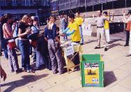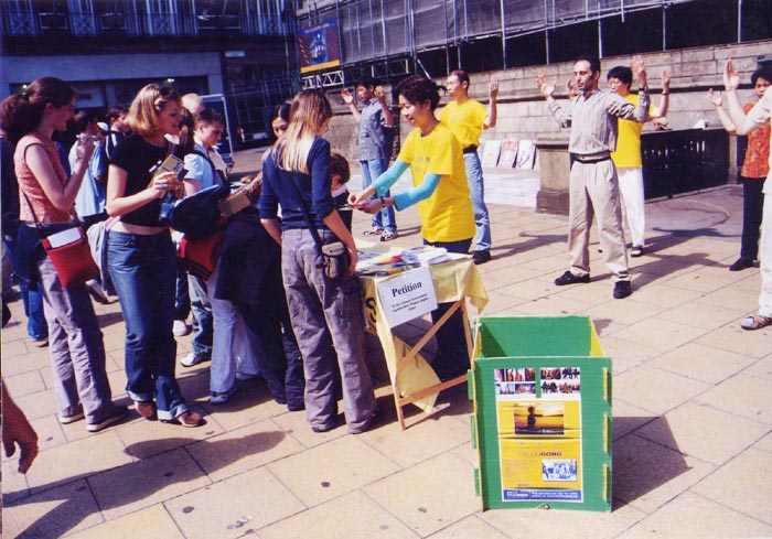这几天,来签字的人太多了,一批刚走,一批又上。大法弟子们都忙不过来了,然而这好象并无多大影响。很多人看了展板就签字,签完字拿了传单就走,根本不需要大法弟子去解释。有的大法弟子笑着说,这里民众的悟性可真高啊。是啊,这次游行得到了全英国大法弟子的支持,大家心这么齐,邪恶因素还有立足之地吗?