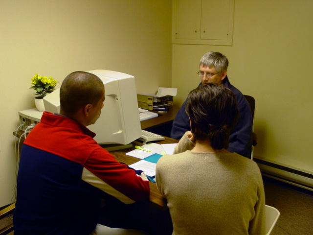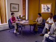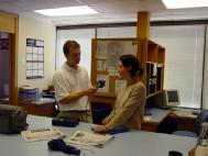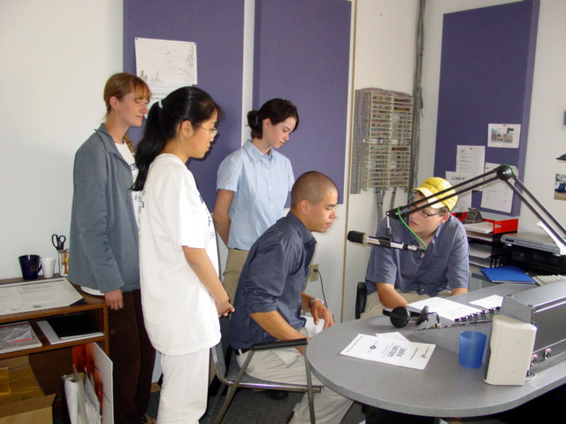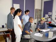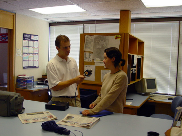 | 19日在Slave Lake城,1210 KWA 电台到场采访, 并随学员一起去了市长办公室作了跟踪报道. | 20日早上,大家来到了High Prairie城,第一站接受了当地主要媒体Radio 1020 CKVH的采访。图为大法弟子在电台接受录音 | 21日,Grande Prairie的主流媒体SUN FM97.7的记者Mike在办公室采访了学员,在认真提问和录音,表示了很大的支持。 |