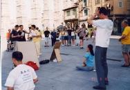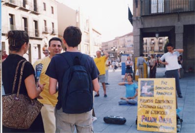 有几个天真可爱的西班牙小孩一直认真的跟随我们学功,他们的父母再三招呼他们回家,他们都不愿离开。一个约三、四岁的小女孩被其父母叫走时,还恋恋不舍地回头看我们。她以孩童特有的纯净的目光注视着一位发传单的学员好一阵,然后又跑过来郑重地伸出小手向学员索取了一张传单,交给她的父母。大法的神圣与庄严,也许这些天真纯洁的孩子们是最能体会的吧。