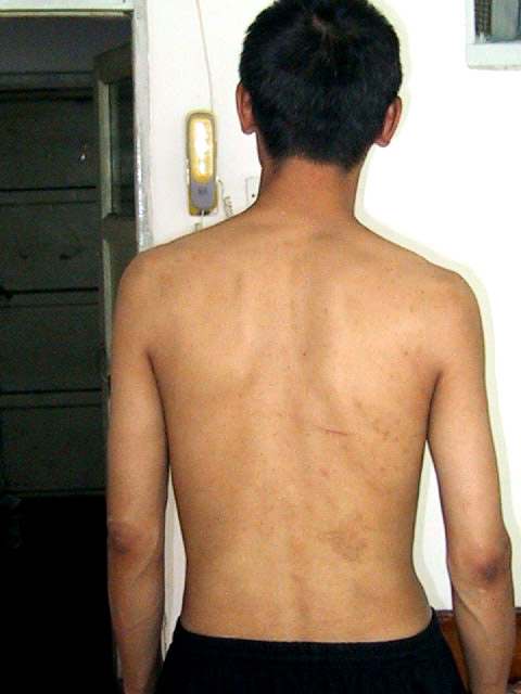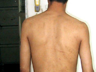 上图是我的后背,虽然过去两年了,很多伤疤都看不清了,但后背的伤疤还很清楚。这个疤痕是2001年9月时市公安局在某宾馆秘密迫害大法弟子的黑窝用电棍折磨我时留下的。