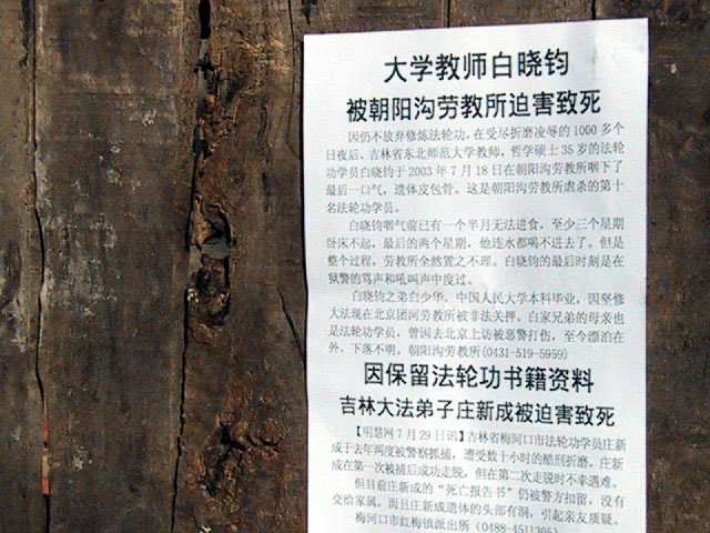 致死》《因保留法轮功书籍资料吉林大法弟子庄新成被迫害致死》“法轮大法好、法轮大法是正法”“别信电视造谣,法轮大法真好;都按真善忍做,社会该有多好。”在朝阳沟劳教所接见室的墙上,大法弟子写下了“迫害法轮功者必遭恶报!悼念同修东北师大教师白晓钧!”“法轮大法好”等(见照片)。很多都是劳教所附近的路边张贴的(头两排的照片)。劳教所墙外的正义之声有力地震慑着邪恶,唤醒着世人。
