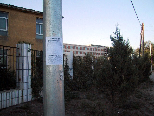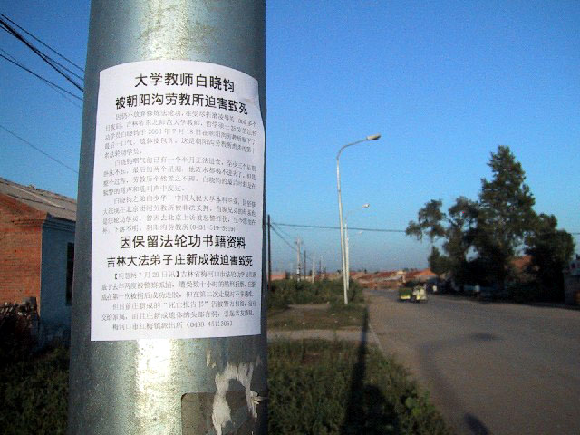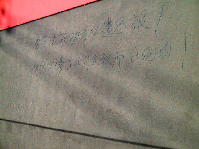 【明慧网2003年9月10日】2003年8月30日,在长春市朝阳沟劳教所的周围写出、贴出了许多大法弟子的正义呼声,劳教所正门口及沿路的电线杆上贴了许多《大学教师白晓钧被朝阳沟劳教所