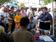 ,效果非常好。我们的摊位前几乎一整天都挤满了人。很多人打听当地炼功点的消息,还有的当场跟学员学功。