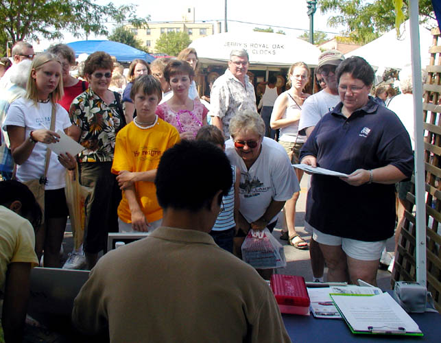 南达科他州(South Dakota)法轮功学员于9月6日参加了Sioux Falls市一年一度的“人行街节庆活动”(Sidewalk Festival)。根据以前的经验,学员们给游客提供免费的书写中文名字的服务,结果非常受欢迎。刚开始是一个学员写,后来有两个学员写,还是忙不过来。一个学员写中文,另一个学员在旁边向等字的游客