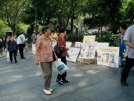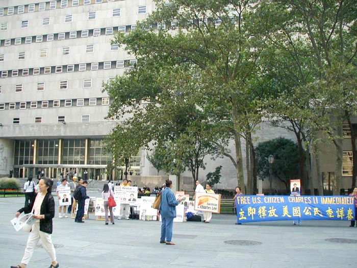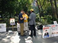 接下来,我们赶往纽约市政府中心11点的另一场新闻发布会。我们还没到,已有记者在等候了。看来“营救李祥春跨美汽车之旅”确实牵动人心。中午时分,人群川流不息,学员们发资料,征集签名,炼功,接待媒体,井然有序。有亲人在国内正被迫害的学员也赶来了并接受了记者采访。行人们看展板,拿资料,要求签名,络绎不绝。NBC电视台,美国之音,纽约日报曼哈顿市办公室派来了又一位记者,布鲁克林大学也有学生记者前来采访。